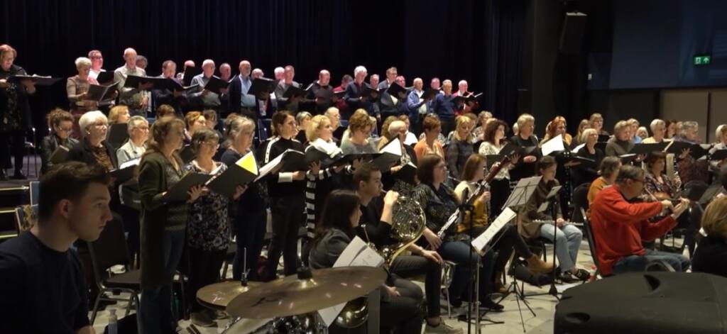 Videobeelden met combo, symfonieorkest solisten en koor: